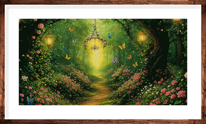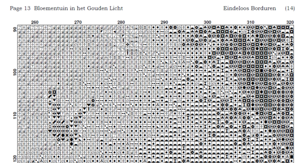 Kruissteek telpatroon van een tuin vol bloemen in warm, goudkleurig licht.