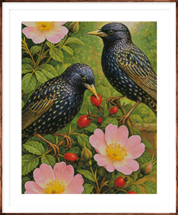 Kruissteek telpatroon van spreeuwen tussen bloeiende wilde rozen in een natuurlijke omgeving.