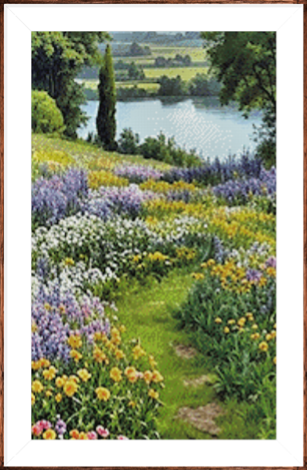 Kruissteek telpatroon van een fris lentelandschap vol nieuwe bloei en zachte kleuren.