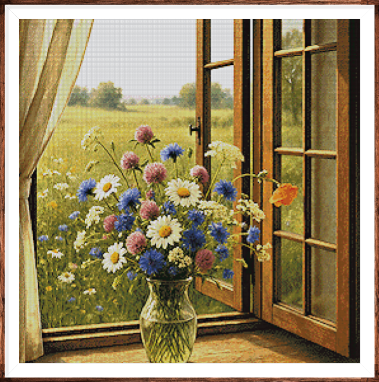 Kruissteek telpatroon van een kleurrijk boeket van bloemen uit het veld.