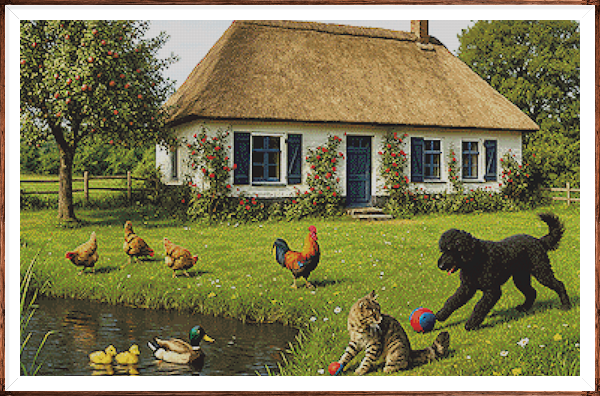 Kruissteek telpatroon van spelende dieren op een boerderij.