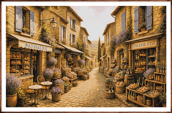 Kruissteek telpatroon van een sfeervol straatje in de Provence met warme kleuren.