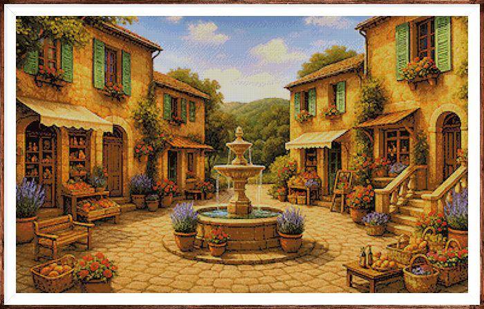 Kruissteek telpatroon van een dorpsplein in het Italiaanse Ligurië.