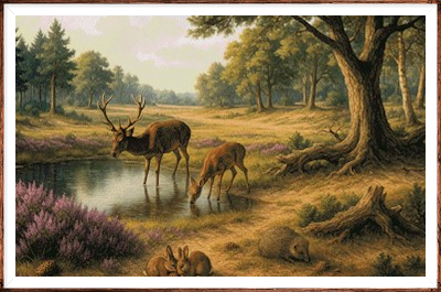 Kruissteek telpatroon van herten bij een rustige drinkplaats in de natuur.