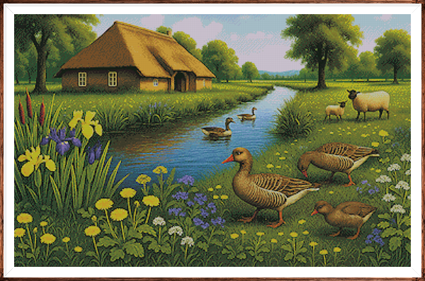 Kruissteek telpatroon van ganzen langs de waterkant bij een sloot.
