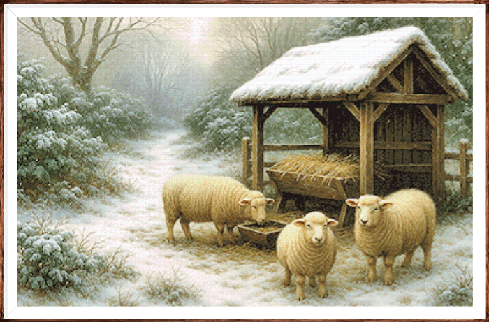 Kruissteek telpatroon van schapen in een rustig winterlandschap.