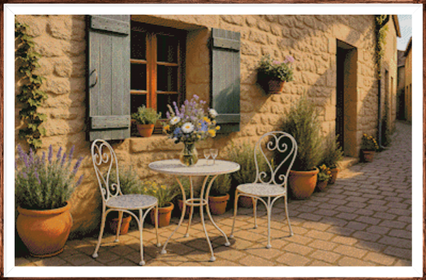 Kruissteek telpatroon van een zonnige zomermiddag in een sfeervol straatje.