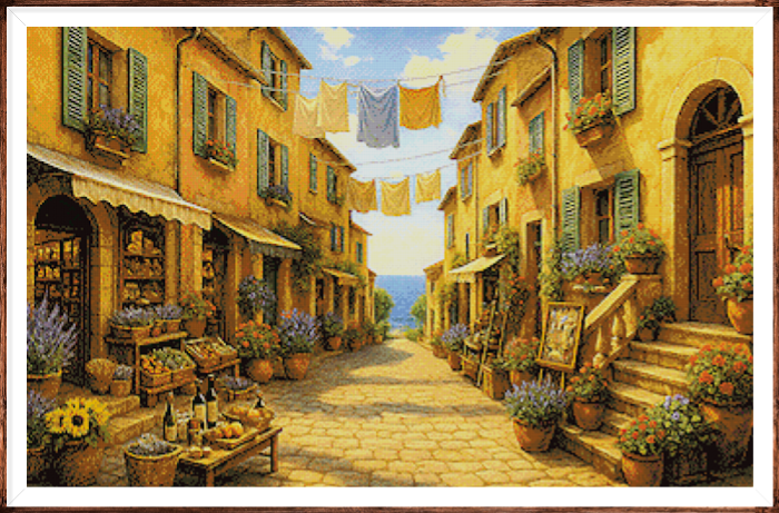 Kruissteek telpatroon van een pittoresk straatje in het Italiaanse Ligurië.