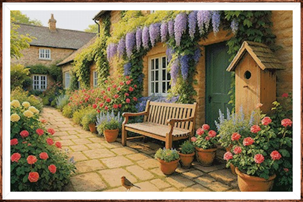 Kruissteek telpatroon van een sfeervol hofje met bloeiende blauwe regen.