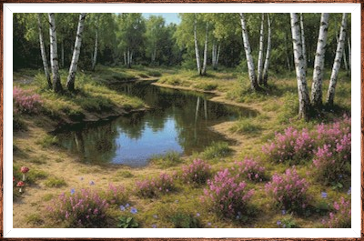 Kruissteek telpatroon van een vennetje omringd door bloeiende dopheide.