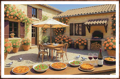Kruissteek telpatroon van een zonnige patio met een zomerse uitstraling.