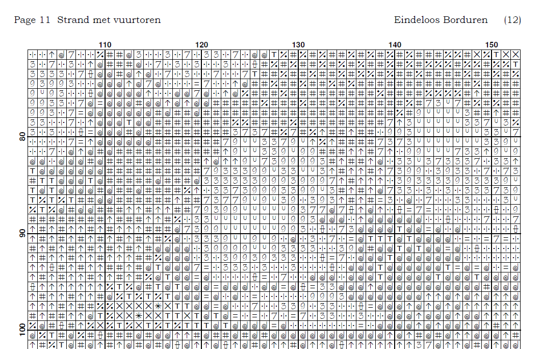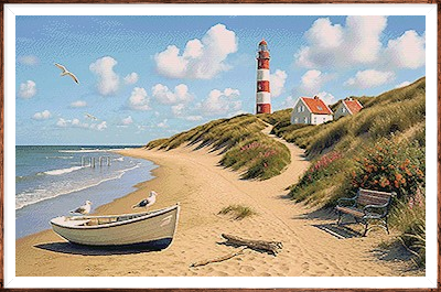 Kruissteek telpatroon van een kustlandschap met een karakteristieke vuurtoren.