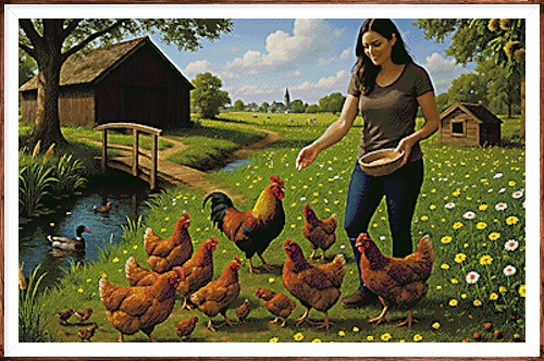 Kruissteek telpatroon van een boerenerf waar kippen worden gevoerd.