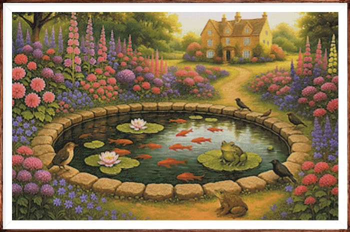 Kruissteek telpatroon van een vijver met bloeiende waterlelies.