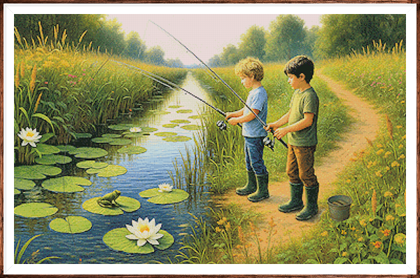 Kruissteek telpatroon van een rustgevend tafereel met vissen vangen aan het water.
