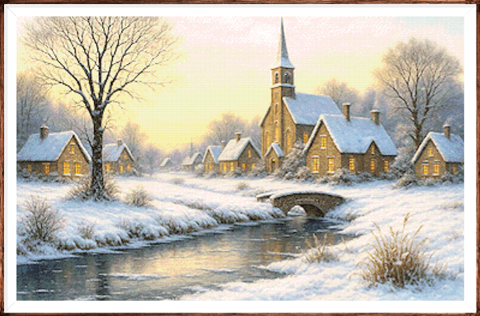 Kruissteek telpatroon van een sfeervol dorpje gehuld in winterse stilte.
