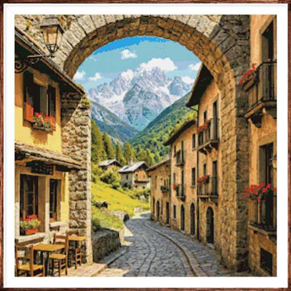 Kruissteek telpatroon van een bergdorp straatje in het Italiaanse Aostadal.