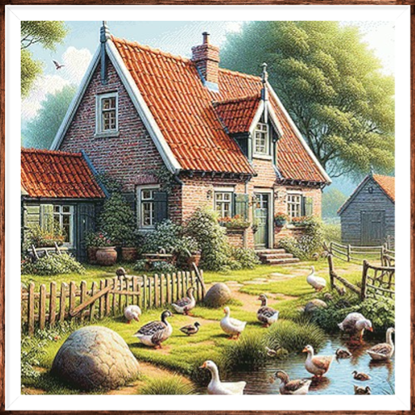 Kruissteek telpatroon van een charmante hoeve met een rustige uitstraling.