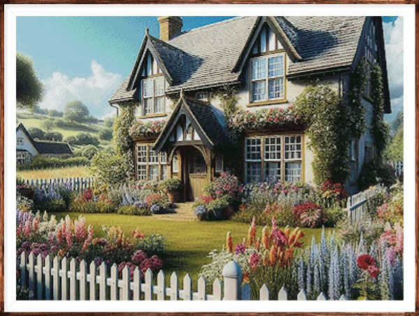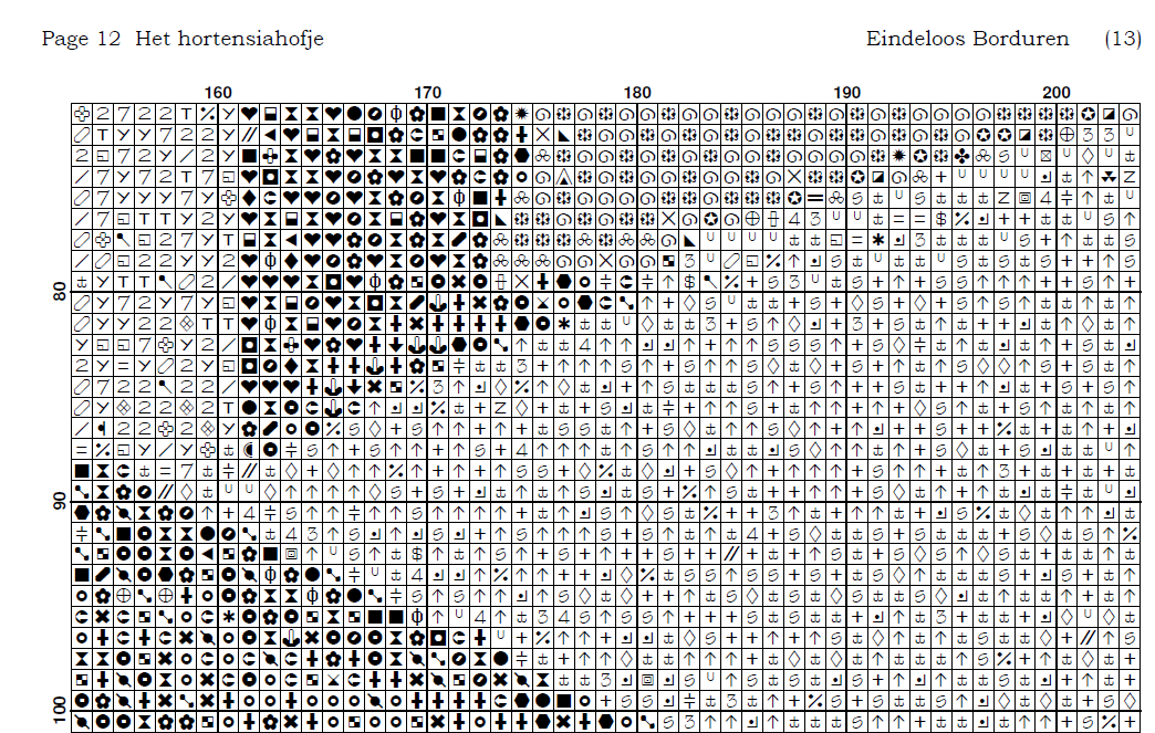 Kruissteek telpatroon van een hofje vol bloeiende hortensia’s.