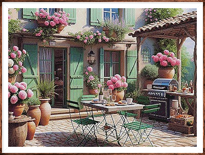 Kruissteek telpatroon van een sfeervolle patio in het zachte ochtendlicht.