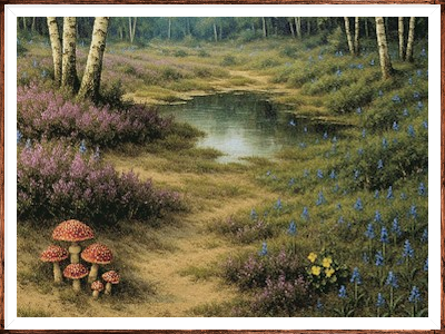 Kruissteek telpatroon van een bosven omringd door paddenstoelen.