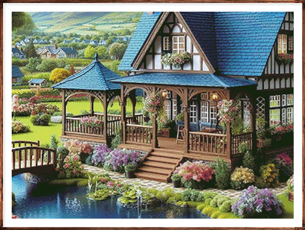 Kruissteek telpatroon van een cottage met uitzicht op een rustig beekje.