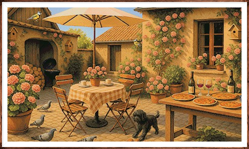 Kruissteek telpatroon van een patio waar een hond rustig aanwezig is.