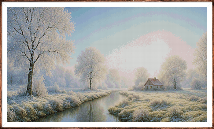 Kruissteek telpatroon van een frisse winterochtend in een rustig landschap.