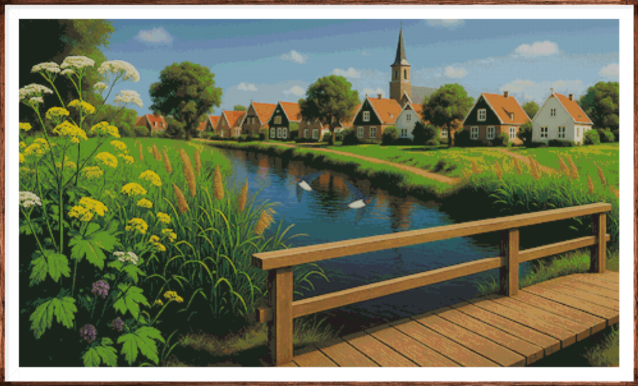 Kruissteek telpatroon van een mooie zomerochtend in een rustig landschap.