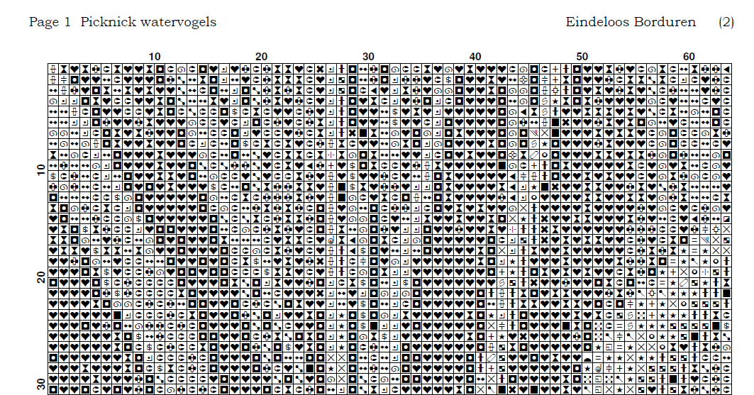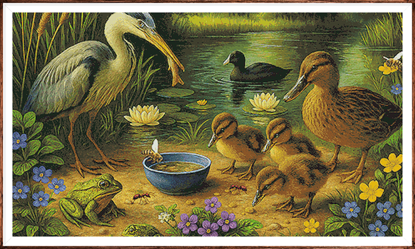 Kruissteek telpatroon van watervogels bij een rustige picknickplek.