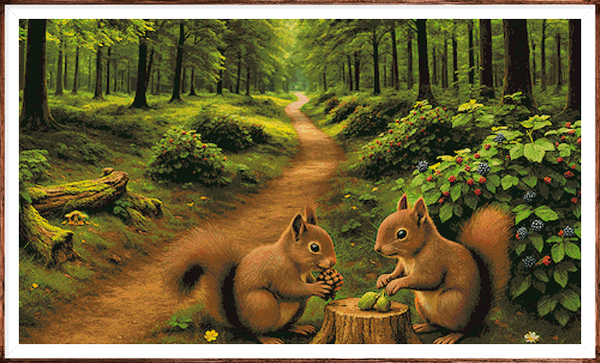 Kruissteek telpatroon van een picknickmoment op een boomstronk in het bos.