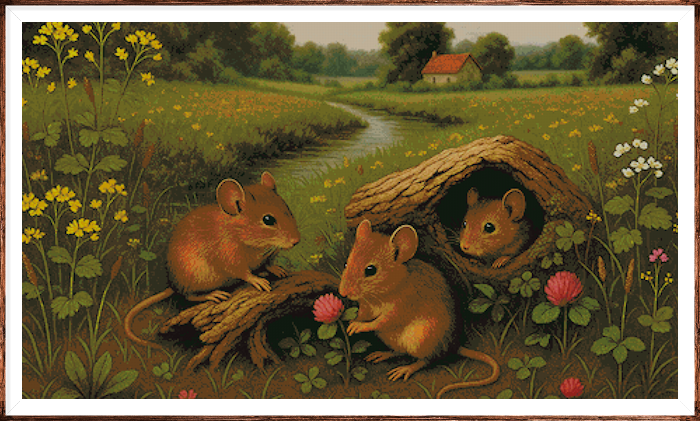 Kruissteek telpatroon van veldmuisjes die samenkomen in een rustig tafereel.