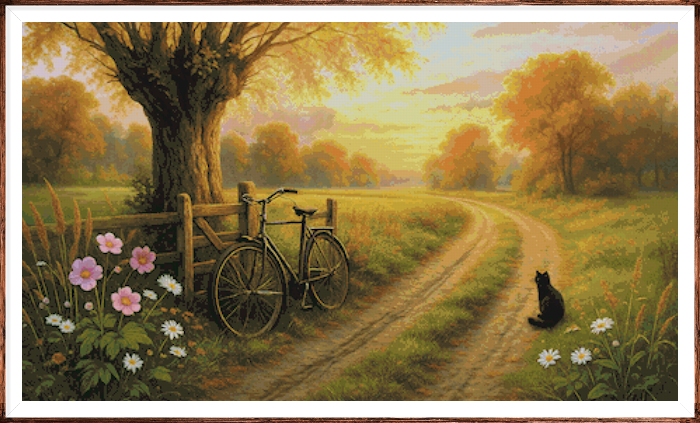 Kruissteek telpatroon van een rustige landweg in het avondlicht.