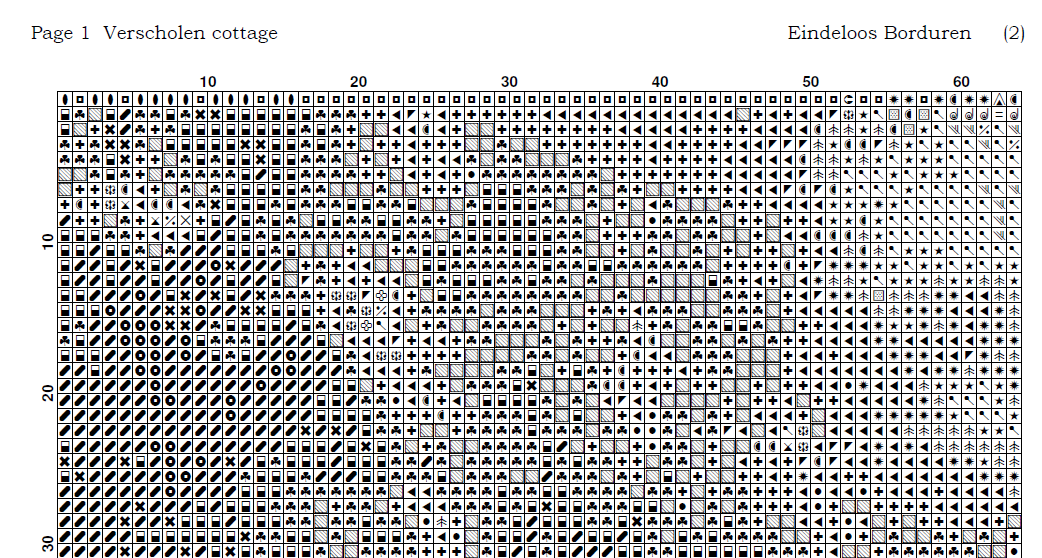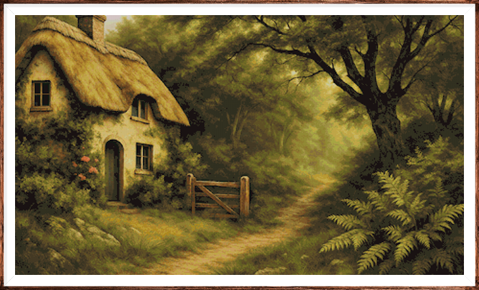 Kruissteek telpatroon van een cottage verscholen in het groen.