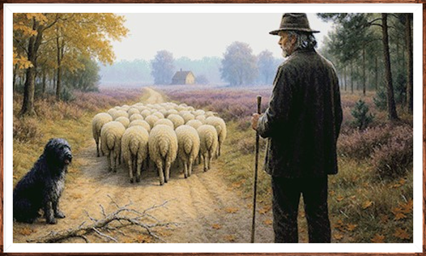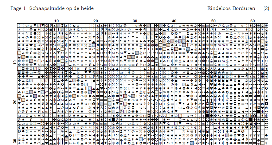 Kruissteek telpatroon van een kudde schapen op de heide.