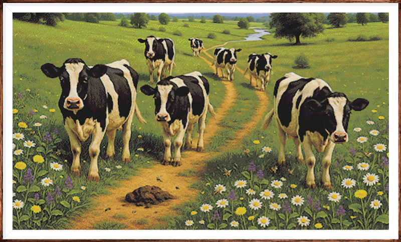 Kruissteek telpatroon van koeien die naar de melkstal worden geleid.