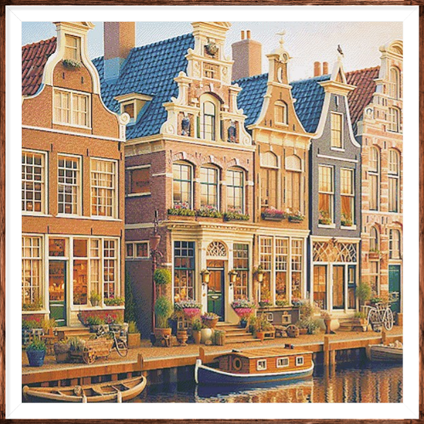 Kruissteek telpatroon van een herkenbaar Nederlands landschap.