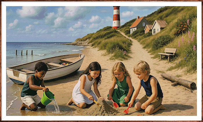 Kruissteek telpatroon van een sfeervol strandtafereel op Texel met zee, duinen en de vuurtoren.