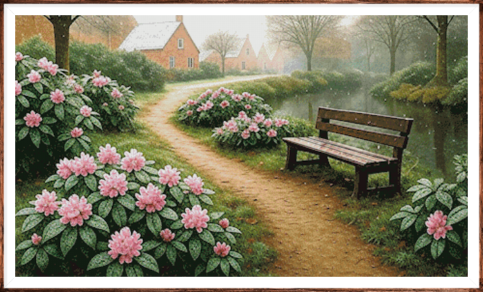 Kruissteek telpatroon van een landschap waarin de eerste sneeuw is gevallen.