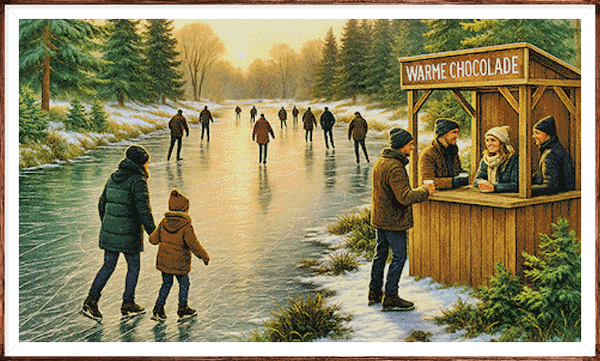 Kruissteek telpatroon van een wintertafereel met schaatsers op het ijs in een nostalgische sfeer.