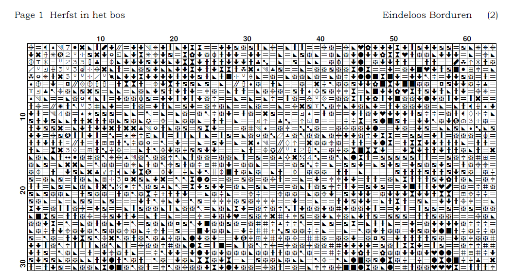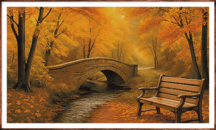 Kruissteek telpatroon van een boslandschap in warme herfstkleuren met vallende bladeren.