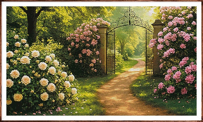 Kruissteek telpatroon van een sfeervol pad omringd door bloeiende rozen.