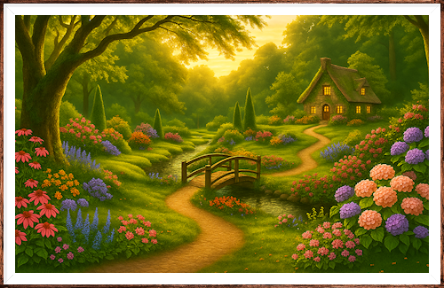 Kruissteek telpatroon van een magische zomeravond in een sprookjesachtig bos met warme avondtinten.