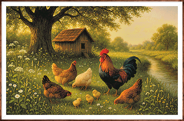 Kruissteek telpatroon van een erf waar kippen scharrelen.